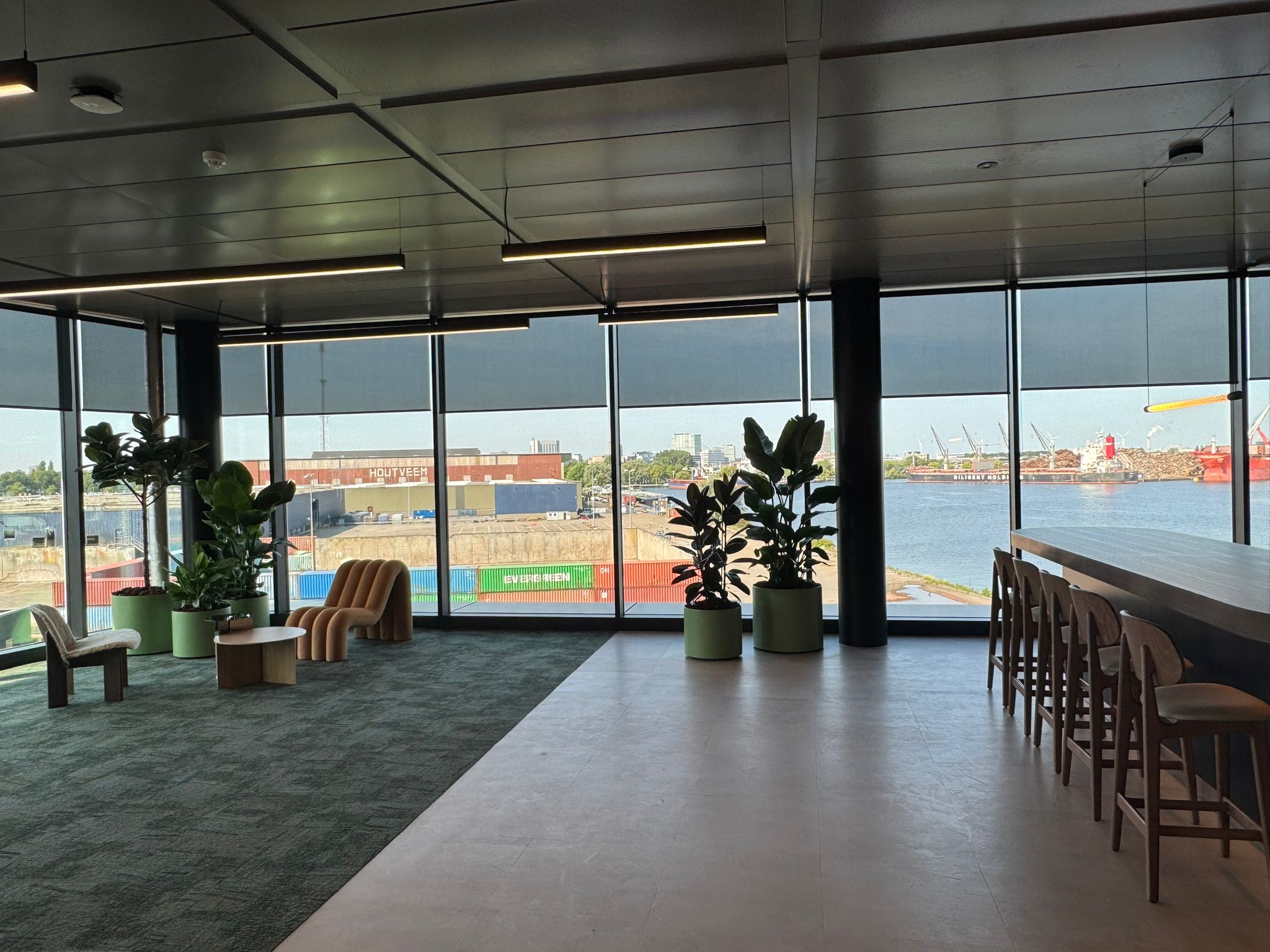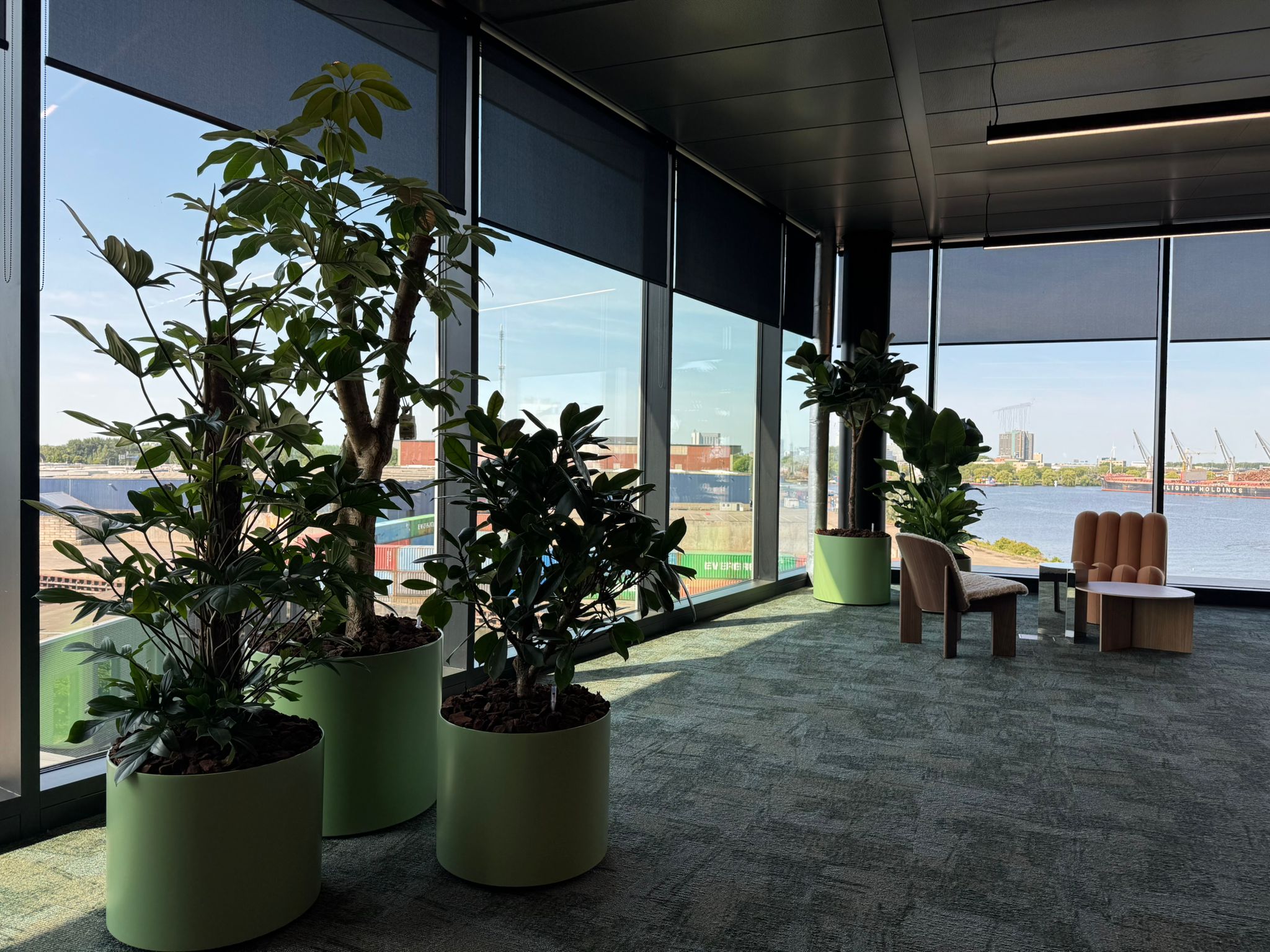 Voor dit project verzorgde Bloei Interieurbeplanting een groene inrichting die perfect aansluit bij het moderne interieur en de warme, open sfeer van het kantoor. Er is gekozen voor een combinatie van grote en middelgrote planten in handgemaakte lichtgroene plantenbakken. De beplanting zorgt voor een frisse, natuurlijke uitstraling en verbetert de akoestiek en luchtkwaliteit in de ruimte. De plantenbakken zijn uitgevoerd in een zachte groentint die naadloos past bij het interieur en het uitzicht over het water versterkt. Zo vormt de groene inrichting een rustgevende verbinding tussen binnen en buiten.