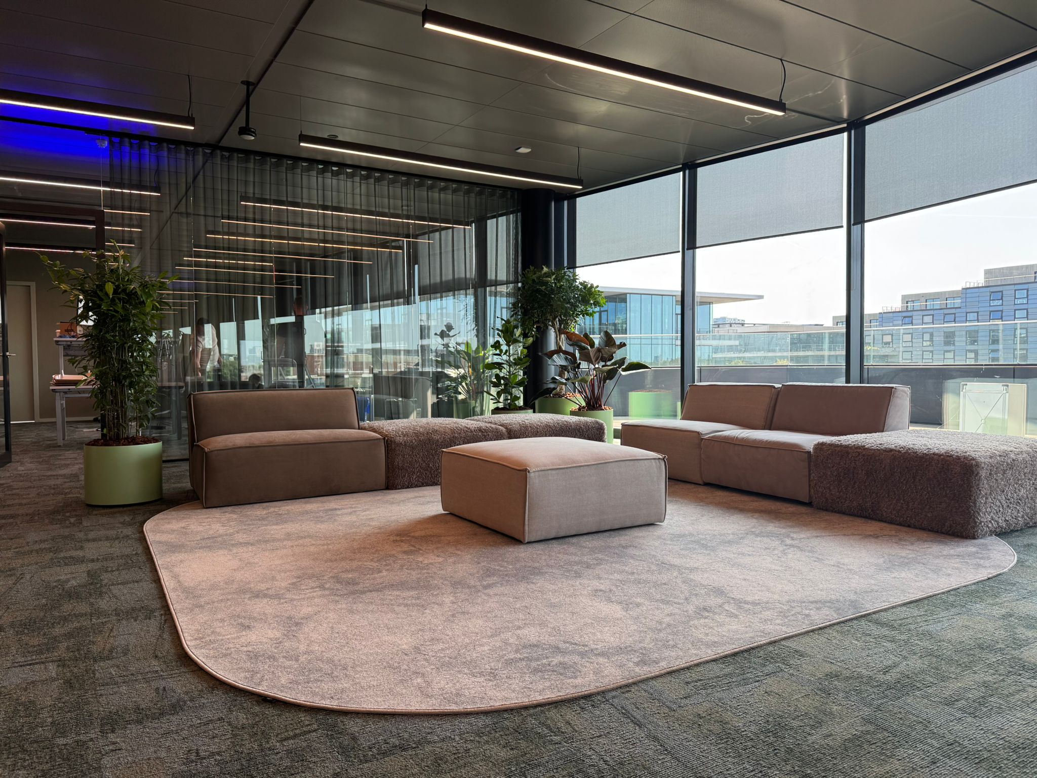 Ontspanningsruimte bij Kearney Perlab met natuurlijke beplanting en warme bruin- en groentinten.